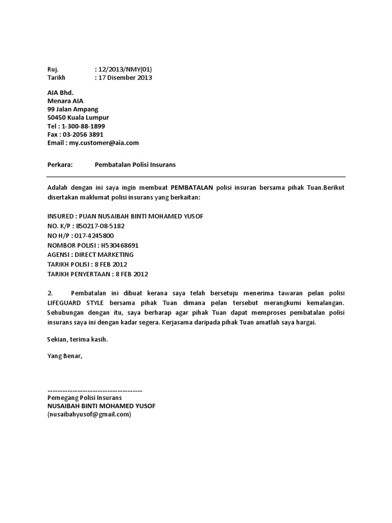 Cara Membatalkan Polisi Insurans AIA. Sekiranya e-mel atau nombor telefon mudah alih berdaftar anda tidak lagi digunakan sila hubungi Talian Khidmat Pelanggan My AIA kami di 1 300 88 1899 untuk mendapatkan bantuan. Untuk membatalkan polisi insurans anda perlu membuat surat yang bisa ditiru dari contoh surat pembatalan insurans.